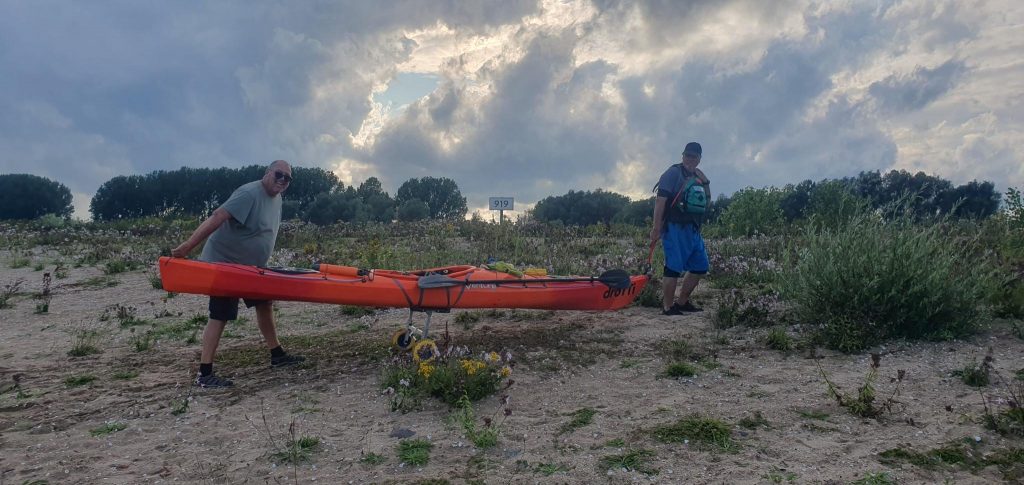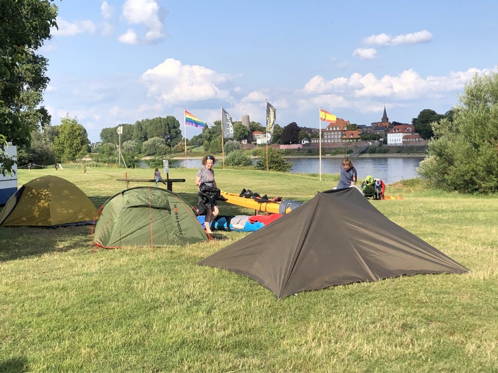 Doch der Westwind mit 4-5 Windstärken war über den ganzen Tag so unerbittlich, dass Weiterpaddeln für drei von uns nach 24 km und für die übrig geblieben fünf nach 36 km (9 Stunden stromabwärts!) nicht mehr möglich war. Permanente Wellen mit Schaumkronen von 1 -1,5 m Höhe können schon Spaß machen, aber wenn man eigentlich vorankomme will, ist der Spaß irgendwann auch vorbei. Also Plan B und C aktivieren ,Campingplatz umplanen und sich freuen, dass alle wieder wohlbehalten beieinander sind.