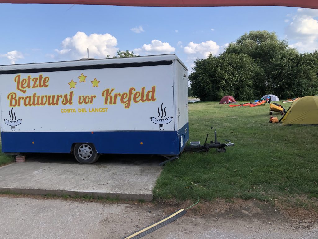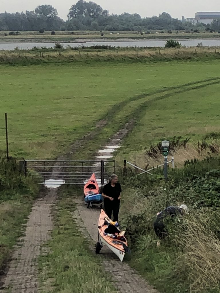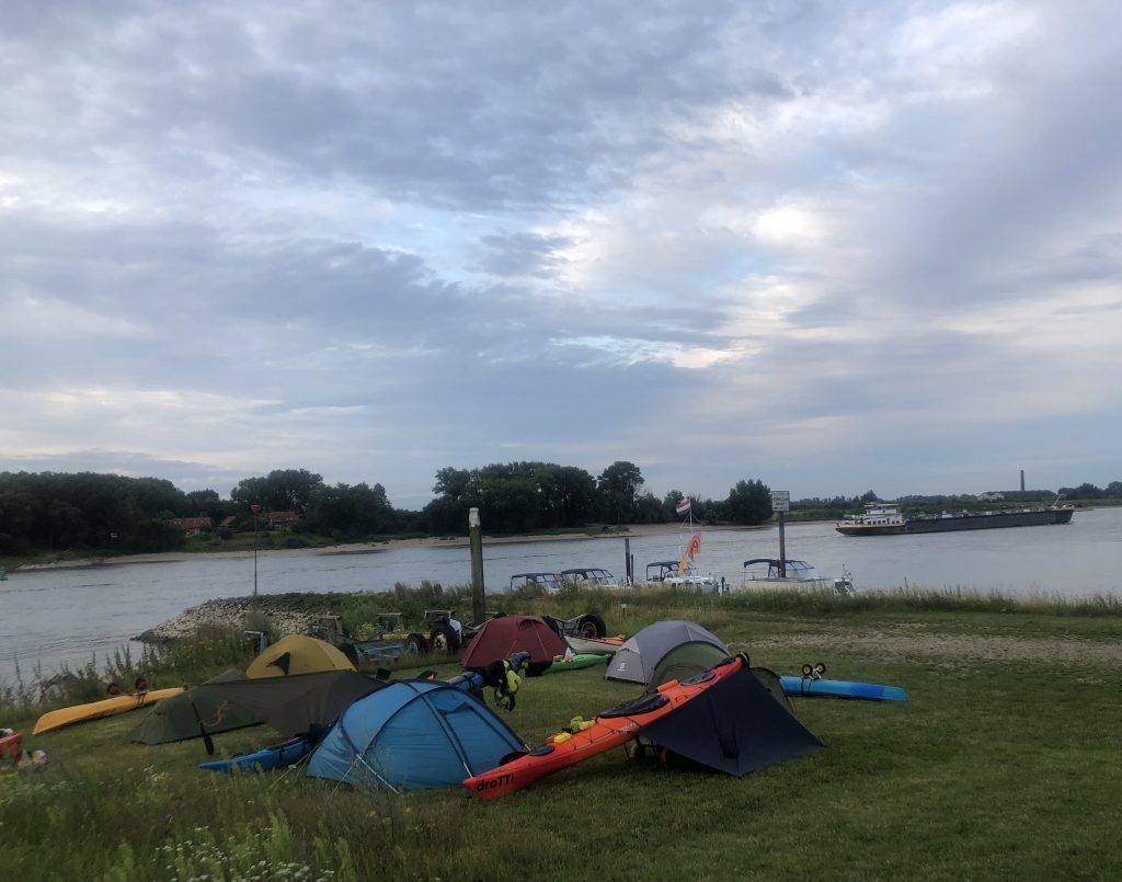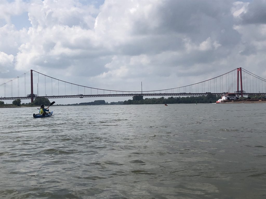 … hallo Niederlande. Unter der imposanten Brücke von Emmerich, immer noch die längste Hängebrücke Deutschlands kurz vor der Grenze ,wechseln wir zu den Nachbarn. Kaum ein Unterschied ist wahrzunehmen, der Strom ist richtig breit, statt Industrie riecht es weiterhin intensiv nach Landwirtschaft, die Rheinkilometer-Schilder sind kleiner, und ein weiteres Schild an einer unscheinbaren Abzweigung zeigt „Waal“.Der Rhein ist Geschichte . Unser Campingplatz heißt Waalstrand kurz vor Nijmegen. Nach weiteren 56 km pflegen wir hier erste Wehwechen an Paddlern und Booten.