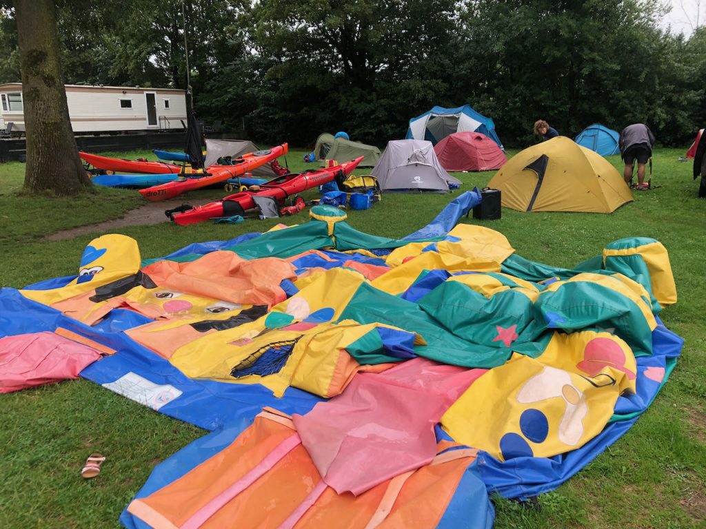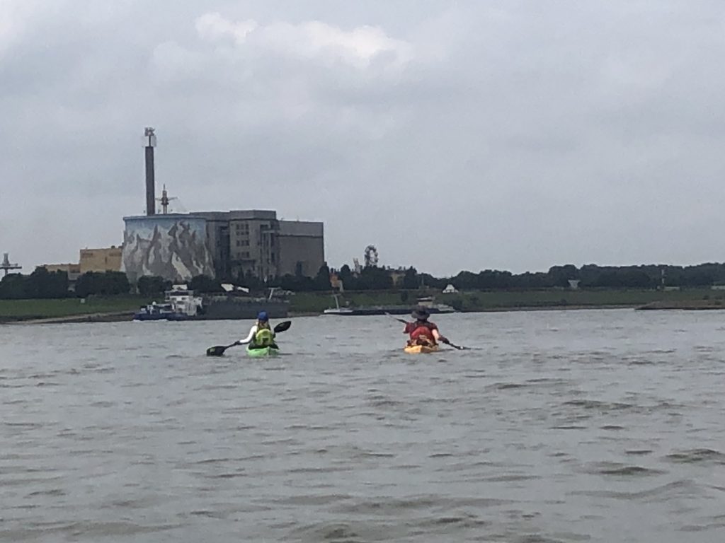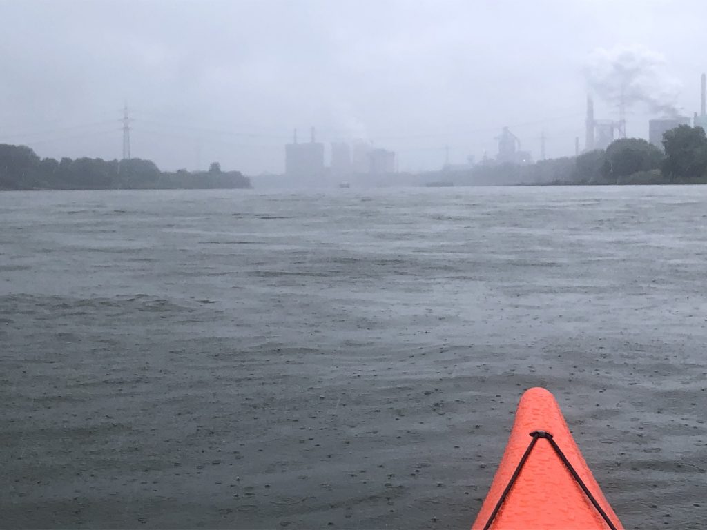 … hic sunt daemones, so bezeichnen antike Landkarten das Gebiet jenseits der bekannten Welt. Tatsächlich hat keine/r von uns die heutige Etappe zuvor befahren. Das Wetter passt dazu und taucht die schwerindustrielle Kulisse Duisburgs in mystische tiefhängende Wolken, in denen die Spitzen der Schlote verschwinden und aus denen es den ganzen Tag regnet. Mal treibt der Wind die Tropfen von der Seite, mal von hinten, und manchmal mit solcher Stärke von vorne, dass es auch eine Seekajak-Tour sein könnte – allein das Wasser schmeckt anders. Nach 64 km ist endlich das Ziel erreicht. Und es hat sich gelohnt: beim Weseler Kanuverein dürfen wir unter trockenem Dach mit den Booten kuscheln und es gibt Kanutenschnitzel mit Bratkartoffeln!