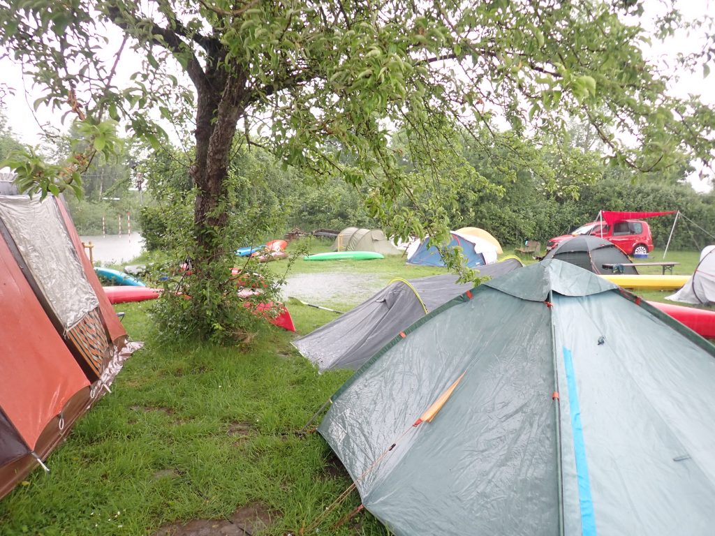Am Sonntag zog das vorhergesagte Unwetter dann doch noch nach Lippstadt. Der erste Wolkenbruch verwandelte den Campingplatz stellenweise in eine Seenlandschaft, die ersten Zelte mussten auf eine trockenere Stelle umziehen. Und Jürgen und Harald mussten angesichts der unsicheren Lage die ursprüngliche Planung der zweiten Paddeltour aufgeben.