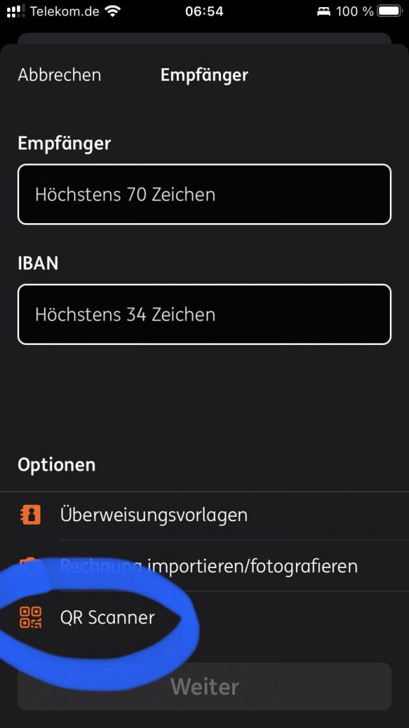 1.Öffnen Sie Ihre Banking App auf dem Handy (z.B. Sparkasse Ihre mobile Filiale, VRBanking oder ING Banking).