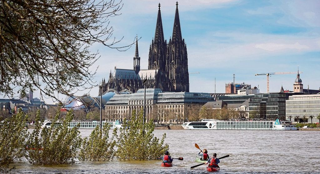 Um 10 Uhr setzten schon die ersten Kanuten an der Stammheimer Rampe ein, um den 7-Brücken-Fahrern stromaufwärts entgegen zu paddeln. Diese waren ihrerseits noch damit beschäftigt, ihre Boote auf den Hänger zu laden. Der Vereinsbus brachte die sieben Paddler:innen und den Bootsanhänger zuverlässig nach Porz und parkte beim Verein Zugvogel. Dann ging es für sie um Punkt 12 Uhr los auf die erste 7-Brücken-Tour classique in diesem Jahr stromabwärts Richtung Rheinkilometer 693 bei herrlichstem Wetter, ordentlich Rückenwind und reichlich eingeschenktem Rhein! Oberhalb der Südbrücke trafen wir dann auf die anderen vier Paddler:innen, die schon ein beachtliches Sportprogramm stromaufwärts absolviert hatten und uns den Großteil der Strecke Richtung Vereinsheim zurück begleiteten.