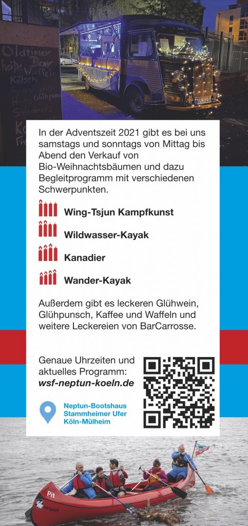 An den Adventswochenenden findet an unserem Bootshaus ein Verkauf von Weihnachtsbäumen statt. Dazu gibt es leckeren Glühwein von BarCarosse und ein Begleitprogramm, mit dem Ihr unseren Verein besser kennenlernen könnt.